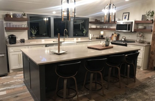 This cabin is a Masterpiece! 2 Minutes from the Self Creek Marina and boat ramp you won’t be disappointed with any of the amenities or ease of satisfaction! This luxurious vacation rental is nestled in a wooded escape close enough to Dallas but far enough to feel the remoteness and tranquility of the great outdoors. Before entering the home you will climb a few reclaimed historic log steps leading to the oversized front door and have option for wheelchair access ramp for handicap mobility. Once inside you will find the welcoming foyer capable of taking your breath away. With the family room and kitchen open to one another there is great space to unload and get acquainted to the finer things in life! The kitchen boasts top of the line appliances with every cabinet and drawer loaded full of your culinary needs. From the k-cup coffee maker to the old school percolator your mornings will have every reason to enjoy a warm cup of Joe on the front porch rockers. The family room has a wood burning fireplace to keep warm and offers a powder bathroom conveniently located for den and kitchen area. Off the kitchen is the laundry room with full size washer and dryer and shelving for pantry goods. The master is a retreat all on its own! This king size suite has bedside chandeliers that suggest the most romantic encounter. The master bathroom is enough to write home about as well! This Magazine worthy and designer inspired “wet room” will take your breath away! Hosting a footed tub, jet shower and three body sprays you will consider skipping the lake and splash in the comforts of this master bathroom. Dual sinks and mirrors make the space comfortable and easy to organize. The original root cellar of this historic cabin has been transformed to a second bedroom with two full size beds and its own bath en-suite with an over sized shower and modern bath elements.