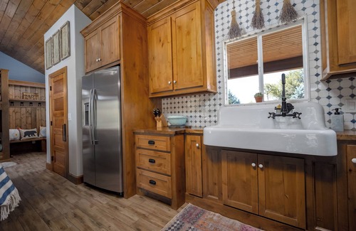 Inside, you will find an open living space with a large, cozy sectional next to the full kitchen. Across the room are 4 large bunks with individual lighting and outlets. The bathroom has ample counter space and a walk in shower. The large bedroom with king bed has a spacious closet and designated desk/work space. There is plenty of room in the bedroom to use the provided air mattress and additional bedding if needed.