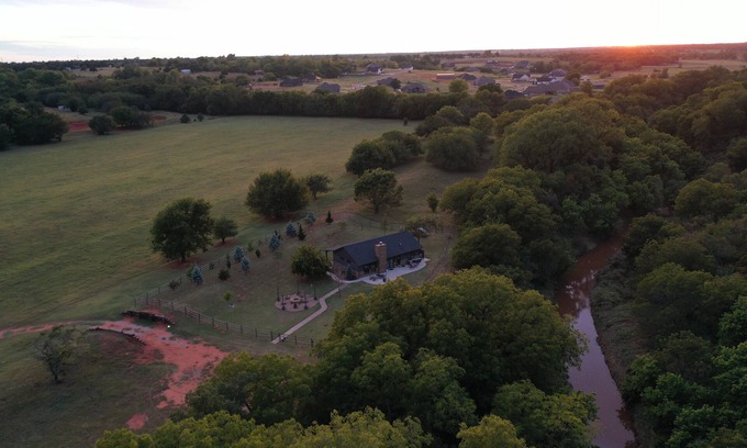 The Bigfoot Bunkhouse is tucked away within private 50 acres, yet only a quick 15 drive to The Springs wedding venue, and 30 minute drive to the airport or OU. 12 acres of private creek side trail to explore and enjoy the sounds of wildlife.