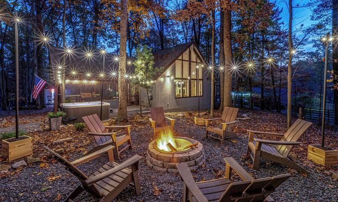 Experience the epitome of luxury in our breathtaking A-frame cabin, nestled amidst the serene woods. This modern retreat offers lavish amenities and a stunning open living space with floor-to-ceiling windows, immersing you in nature's beauty. Indulge in the private hot tub, relax by the fire pit, and unleash your culinary skills in our fully equipped kitchen. The large screened porch provides a tranquil oasis, while nearby hiking trails, golf courses, and the sports center with outdoor/indoor pools, gym, spa and pickleball offer an unforgettable getaway!