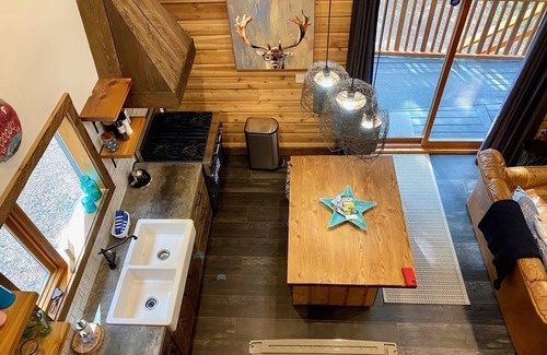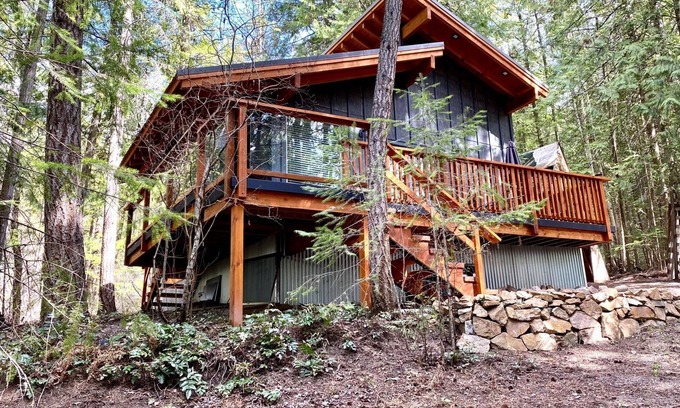 Located at Shuswap Lake in Blind Bay. This custom built cabin offers peace and tranquility, nestled up in a cedar forest. Sit on the front porch and listen to the sounds of a creek running past. The wrap around deck offers a view of the lake, BBQ & patio dining. Step inside and feel the rustic, warmth of the interior, with cedar plank walls, custom barn wood trim and kitchen cabinets. Vaulted ceilings with fir rafters and a loft for extra sleeping space. The bathroom is a private oasis with a custom vintage bathtub that sits in front of a large picture window out to the forest. There is a 5 minute walk up & down a steep hill to the entrance of our property. Walk across Eagle Bay Road for trail access to our private beach. Please NOTE: cabin is not Air Conditioned, there are 2 large ceiling fans & the forest shade which maintain a comfortable interior temperature. PLEASE NOTE: This is a legal short term renters with owners living on site.