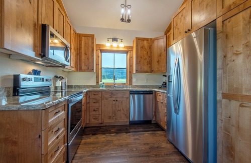 ⦿ Spectacular Views: Enjoy uninterrupted, panoramic views of the Teton Mountain Range from your front deck. Imagine sipping your morning coffee in Adirondack chairs while soaking in one of the most incredible vistas in the Valley.