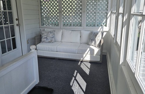 This carriage house is newly renovated! When you enter the unit you can enjoy this quant sunroom to relax and unwind. Fully equipped kitchen, dining area with table and chairs, brand new furniture throughout, 50" Roku Tv and internet. Bathroom with rain shower head, laundry room with washer and dryer, and a cozy bedroom with a queen size day bed.