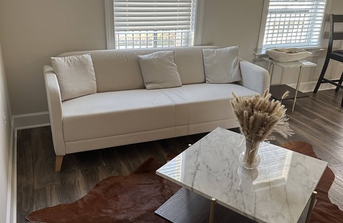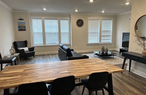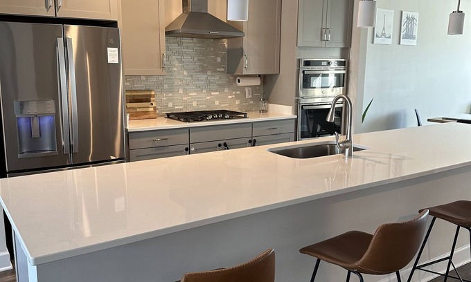 Near Apple Store, Starbucks, theaters, Wegmans. Stylish interior, movie-ready TVs, fast internet, workspace. 3rd-floor unit, private garage, serene. Ideal for leisure, business.