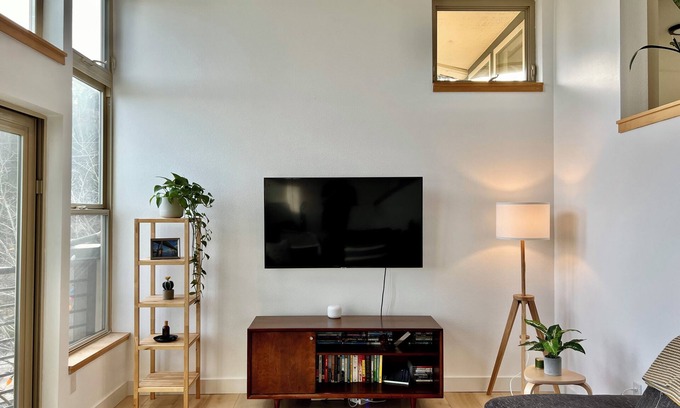 Basecamp PDX is a beautifully appointed condo is perfect for traveling nurses, professionals, and remote workers looking for a place to call home for 31 nights or more. Near floor to ceiling windows flood the Scandinavian design inspired space with natural light and provide stunning views of Portland and Mt. Hood.