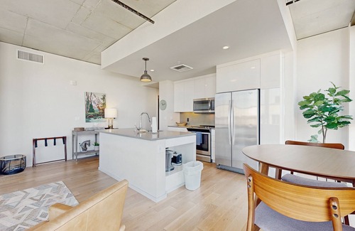 This corner unit features floor-to-ceiling windows that flood the space with natural light and offer sweeping views of the vibrant Slabtown neighborhood. The open main living area is anchored by a cozy gas fireplace and flows seamlessly into a modern kitchen, fully equipped with all the necessary amenities for your stay. The master suite includes a private ensuite bath and a stylish sliding barn door, while down the hall, the guest bedroom and a full second bathroom offer additional comfort and privacy.