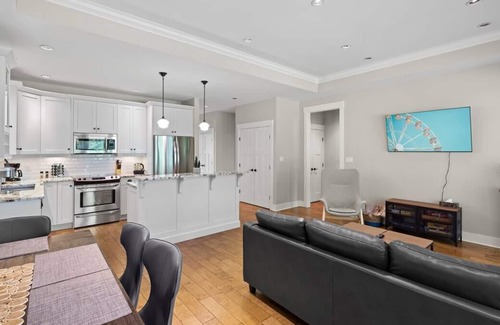 Luxuriously-finished 1400sqft 3 bedroom Cottage w/contemporary fixtures/finishing, lovely outdoor living space, and 2 Baths w/heated floors. Open concept Kitchen/Living/Dining Room. Gourmet Kitchen w/island, breakfast bar, and french doors open to lrg covered patio w/ peaceful treed view. Two bedrooms with queen beds, third bedroom has bunk beds. Flat screen tv, books and games in the living room. Seating on the patio. Your private residence is a five minute walk to the beach, seasonal pool and hot tub. Short drive to Skiing at Mt. Washington.