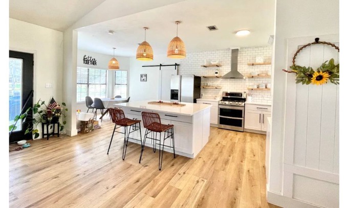 Freshly Remodeled comfortable Farmhouse-style country stay, featuring open concept Kitchen/ Dining/ Living area with huge island, gas stove, & views of nature out every window. 3 bedrooms, 2 full bathrooms. Outdoor patio with BBQ, fire pit, picnic tables, sprawling trees & yard. Covered front porch with swings to gaze at the wildlife & sunsets.