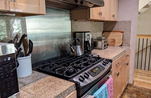 Enjoying meals prepared in the fully-equipped kitchen with stainless steel appliances, heated flooring, timed coffee/espresso maker ready in the morning when you wake up. The easy gas lit, wood-burning fireplace creates a warm and inviting atmosphere that is perfect for hanging out in the living room, dining room or kitchen area. Living room has a second deck with barbeque and seating.