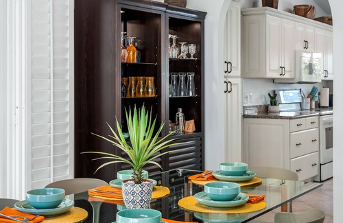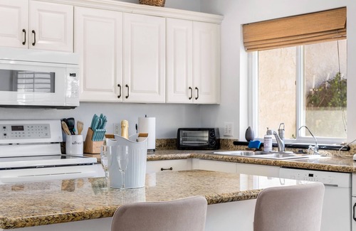 - Fully stocked kitchen for all hosting and cooking needs, kitchen island with 2 bar stools