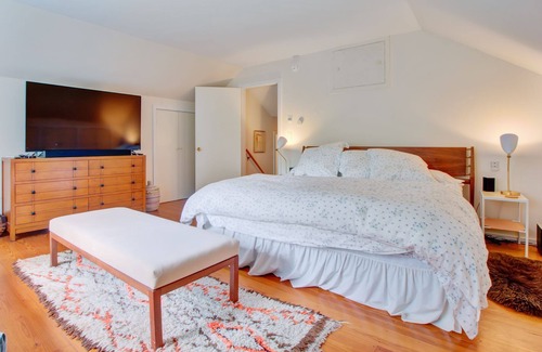 The house features a large fireplace, open kitchen, baby grand piano, designer and mid-century furniture, king and queen beds, two 4k TVs, records and more.