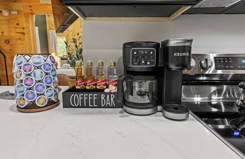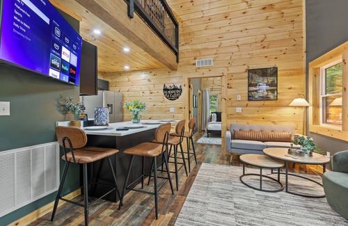 Step inside a thoughtfully furnished cabin with modern finishes, a fully stocked kitchen, two king suites, and a loft bunk area. Relax with three 50" Roku TVs, a cozy indoor seating area, a coffee bar, and stylish touches throughout.