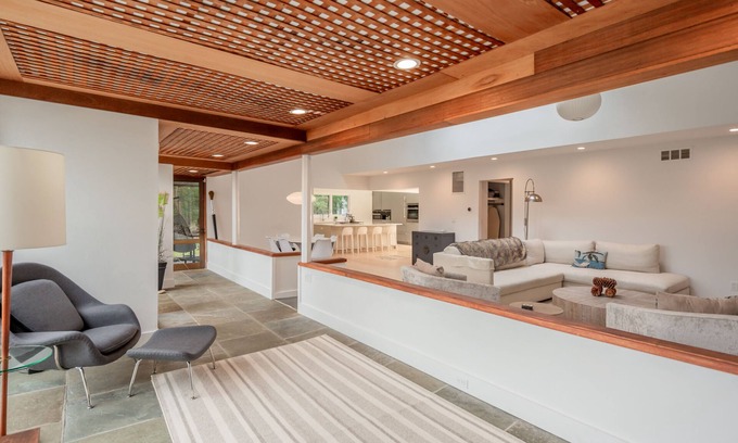 Enjoy pure tranquility in this renovated, modern home on a large nature preserve. The home features modern furnishings, high-quality bedding and a cook's kitchen. If you thrive in a clean environment and love modern architecture, you will adore this house. Design features are by well-known architect Fred Stelle for the original owner, a writer for Mister Rogers' books. The interplay of angles of wood and glass allows light and nature to be the stars of this home. Simply elegant and immaculately clean.