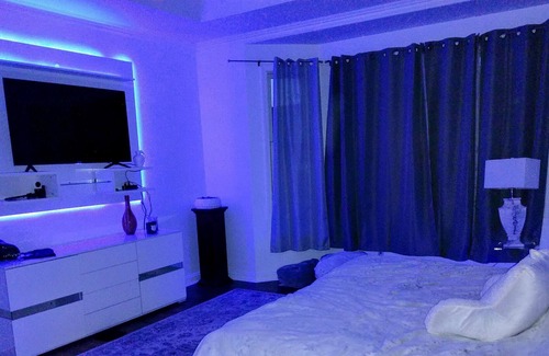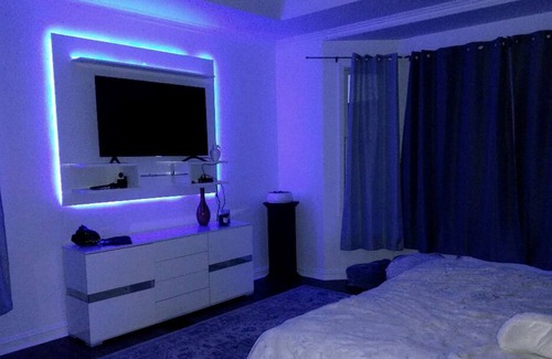 Modern Styled newly renovated one level ranch home is perfect for group trips NO PARTIES the police will be called if your planning parties or romantic Redrock getaways located 12 miles to lower lot park from driveway. 2 bedrooms with Cali king and queen size beds, satin sheets and down comforters for each, plenty of extra bedding available. Office with desk printer and including a round flip-out sofa bed apx little smaller length wise to a queen size mattress, that could be considered a 3rd bedroom. House is equip with other available sleeping accommodations in the sitting room which has a large comfy white couch and love sac, which is basically a huge oversized and stuffed round bean bag but containing temperpedic stuffing, also blow up mattress available & two full bathrooms, one with a jetted tub the other is a large tub both with showers also. New contemporary furniture in living room with built in wall speakers, leather couch and concrete table. Dinnett with four person high top table and chairs and 3 barstools surrounding kitchen. Kitchen is equipped with new LG stainless appliances including two ovens and fully stocked with air fryer, kuregi coffee maker and k- cups, grinder, pots, pans mixing bowls, Tupperware, crystal stemware,steak knifes. Laundry room and detergent Gas Grill on back patio. Driveway or 1 car garage parking, safe highly desired neighborhood. Surrounded by all amenities: food, movies, mall, highway & mountain access , workout facilities & groceries within a mile. Basement is locked and not accessible it's unfinished and used as storage.