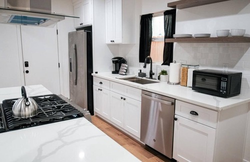 Enjoy a stylish experience at this centrally-located luxuriously furnished from head to toe modern home. We have a beautiful new outdoor seating, a firepit, and an outdoor bbq. We have bar seating and a decked out chef's kitchen. Our comfy living room has a TV w/Netflix and Hulu capable, w/2 more TV’s in each room. Park one car in our driveway. We are in Compton close to the airport and Sofi Stadium and central to everything in Los Angeles.