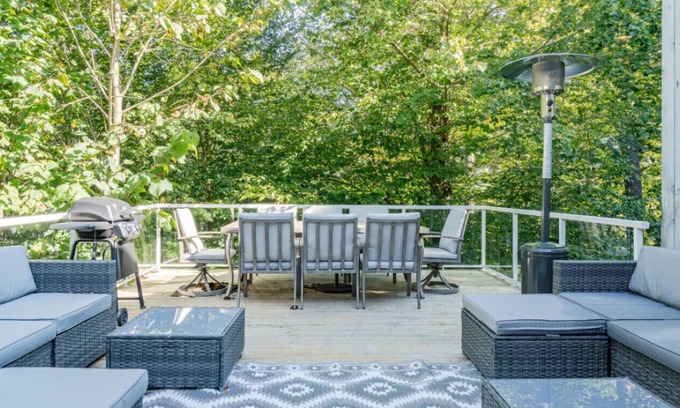 Back downstairs, you have a good-sized deck set amongst the trees. Dining for 8, sofa seating, patio heating, and the BBQ are all here. In addition, there is a lawn garden area at the front with a firepit and forest views.