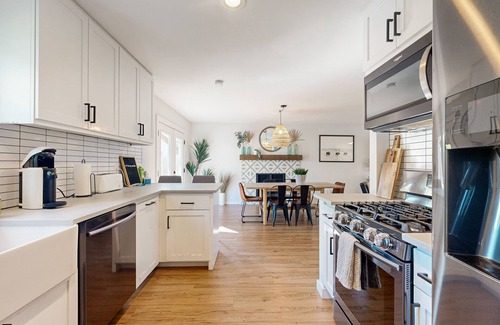 Step outside to the backyard oasis featuring a pool, hot tub, outdoor dining table, fire pit, cornhole, and plenty of space for the kids to play. Stay active with the Peloton bike, treadmill, weights, and other fitness equipment provided. Additionally, guests have access to a washer and dryer for added convenience.