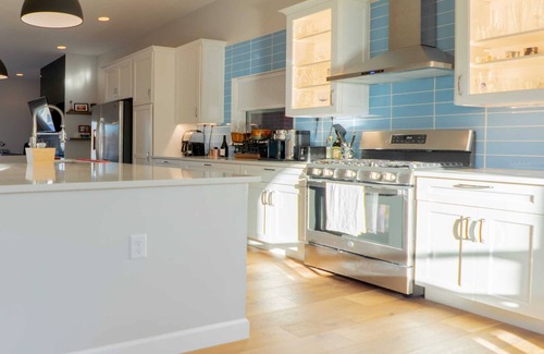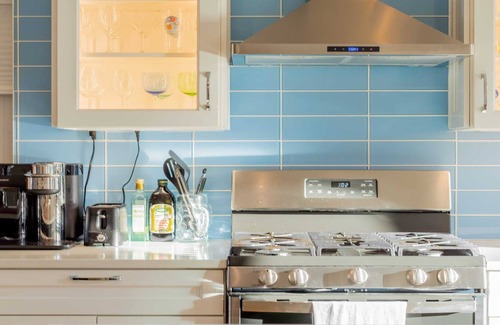 Step through into an open, gourmet kitchen with polished wood floors elegantly finished white cabinetry. Enjoy our modern appliances and a kitchen that comes fully equipped with everything you could need. There is a full-size fridge/freezer, a freestanding oven, a built-in microwave, a coffee machine, an abundance of stylish dinnerware and cookware.