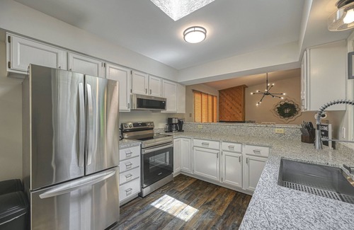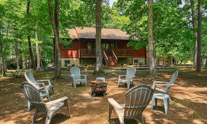 Situated on 1-acre of wooded land, this newly remodeled cabin boasts an updated kitchen w/ stainless steel appliances and breakfast bar, two separate living areas, high-speed internet, open floor plan basement w/ wet bar, shuffleboard table, and multiple outdoor areas to enjoy including several decks, a patio, and a fire pit area.