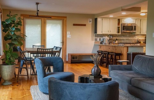 When entering you're immediately greeted with an open concept living space and modern kitchen with sweeping panoramic views of Heron Cove and our towering pine trees that gives you the impression you're in a quiet corner in the forest. In our basement, you have a full entertainment area for all, with a 55 inch TV, foosball table, vinyl player, chess board, and arcade. The loft area also hosts has a wrap around couch and office for Flexible Fridays and WFH. Outside, you will have your own private dock with kayaks and a canoe awaiting the day's water based adventure with two areas where you can gather and share a fireside evening with your loved ones.