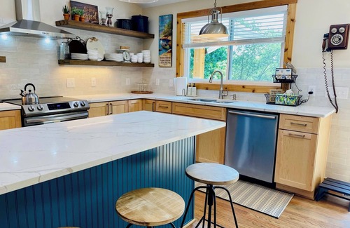 Our kitchen is modern and fully stocked. We even have a beverage fridge making relaxing a breeze! You can grill on the side deck, or whip up dinner in the spacious kitchen. The stone fireplace in the great room is perfect for chilly nights. Cozy up on the couch to catch a movie anytime.