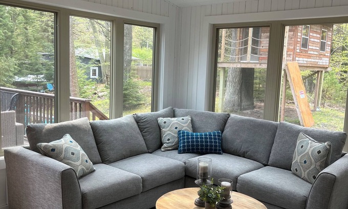 Adjacent to the kitchen, the bright and cozy sunroom features a new sofa, heated floors, tall windows, and skylights, providing a perfect spot to unwind. Settle in with a good book and listen to the soothing waves of Lake Michigan while enjoying your morning coffee or watching the graceful deer!
