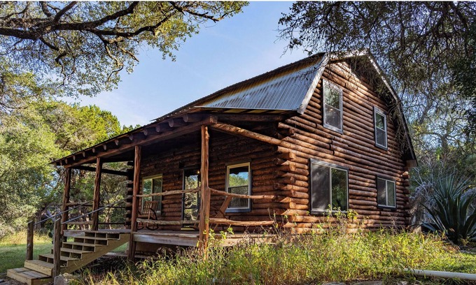 Our modern, tidy log cabin is set on 10 pristine wooded acres in Driftwood. You'll feel like you've escaped to a wooded paradise after the long, curvy driveway takes you to the cabin and our friendly alpacas. Only 35 minutes to downtown Austin and 15 minutes to Wimberley, wonderful restaurants, shops and outdoor activities are close if you need them. The cabin has all the modern conveniences, and is fitted with luxury Frette linens and towels and down comforters and pillows. Our cabin is nestled deep in the woods and you won't see another house or person unless you really want to! The property is 10 fenced acres (5 acres for your enjoyment) and is great for hiking and exploring. There are fox, deer and a plethora of native birds . Our alpacas are free range but will be fenced during your stay. Feel free to feed them alfalfa and pet them. The home has satellite TV and internet (Starlink), brand new air / heat, gas range, washer / dryer and dishwasher. It is fully outfitted for cooking meals with friends and relaxing on the large porch. We also have a fire pit, folding chairs and an outdoor grill on the back patio. The beds (2 double beds in one room and 1 queen in the other) are new with luxury linens. There is a half bath downstairs and a full bath upstairs. We have a private residence on the very back of the property that is infrequently used. The residence is not visible from the cabin.