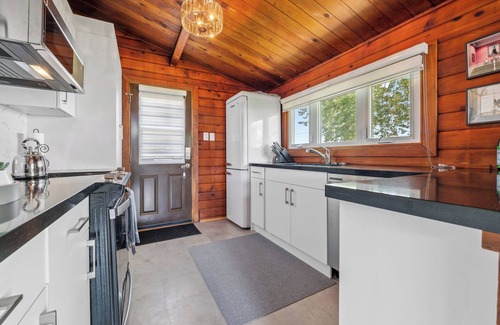 Grab your morning coffee and take in the panoramic Lake view! This updated panebode log cottage offers a rustic homey feel with all the modern comforts, including a fully equipped kitchen, coffee, a comfy sectional, wifi internet, A/C & ROKU TV. The sleep quarters include 2 Bedrooms: one with a Queen Bed, the other with a Bunk Bed that has a Twin on top, Double on bottom. Enjoy the renovated bathroom with tub & waterfall showerhead. With plenty of board games and some puzzles & books, you can enjoy a traditional cabin stay - and take in the peaceful, quiet nights. The cottage sits across the road from our private owned shoreline with a fire pit & gazebo, atop a raised rock breakwall that provides a gorgeous backdrop for Lake Erie. Great local hotspot Hippo's marina patio is just minutes down the road, and there's also Long Beach & Rock Point Provincial Park not far away for a swim or hike. Take in some Niagara wineries with just a 40 minute drive, or get in a game of golf with your choice of 3 courses down the road or just 15 minutes away.