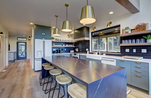 Kitchen: The kitchen is the heart of the open-concept main floor and features a stunning quartz waterfall island, GE Cafe Series appliances, and beautiful open shelving. For coffee lovers, you'll find a complete line-up of Fellow Brand coffee products complete with a scale, a grinder, and a kettle for beautiful pour-over coffee in our Chemex, or large batch brewing in our Moccamaster brewer. We provide each guest with a complimentary bag of fresh locally roasted coffee.