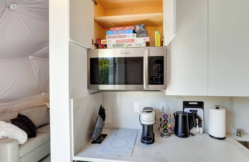 KITCHENETTE: Mini fridge, 2-burner electric stovetop, microwave, Nespresso machine w/ pods, toaster oven, water filter/ice maker, dishware/flatware, cooking basics