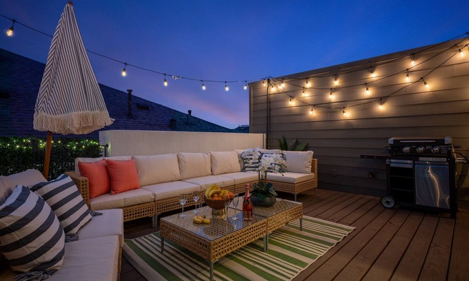 • Rooftop Area: Cozy outdoor seating, a dining area with an umbrella for shade, ambient string lights, and lush greenery for privacy. BBQ grill and utensils available for those who enjoy outdoor cooking! Perfect for morning coffee or relaxing with a partial view of the city skyline.