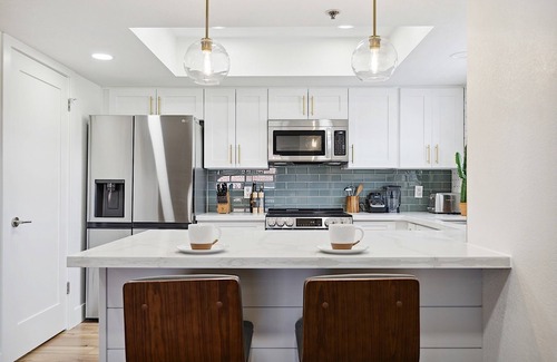 Inside, discover updated appliances along with scattered hints of Mid-Century Modern design throughout. Prepare your favorite dishes in the well-equipped, full kitchen with stainless steel appliances and a breakfast bar for two and then meet up for meals or family board game nights at the table for four. This home also offers an open living area with a gas fireplace, a desk and chair for your laptops, and a TV ready to stream your favorite channels.