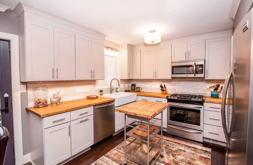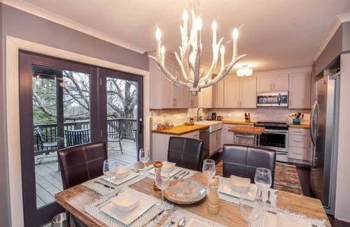 Enter through the front door into the main level foyer and you will find the kitchen and dining area immediately on your left. Dine six guests comfortably after preparing meals in a kitchen equipped with butcher block counters, custom Shaker-style cabinets, stainless appliances, and a gas cooktop. Down the main hall is the living room looking out at the rear covered porch and onto the private back yard surrounded by woods. The living room has a large wall-mounted HD Smart TV, comfortable upholstered and leather furniture, with a good mix of rustic and modern touches. Glass doors lead out from both the kitchen and living room onto the covered porch and deck, which wraps around from the front, side, and rear, and offers comfortable outdoor seating with heat for chilly days and nights, an outdoor dining table, and a stainless gas grill. Also on the main level is a half-bathroom/powder room which also serves as a laundry room.