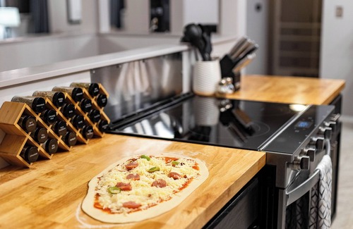 The Chalet is designed to bring outdoor spaces inside. The upstairs living room flows into the outdoor sectional seating, the chef's kitchen flows onto the deck, where you'll find an oversized 5-burner professional gas griddle.