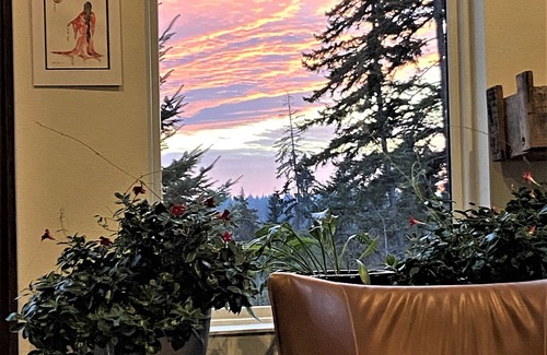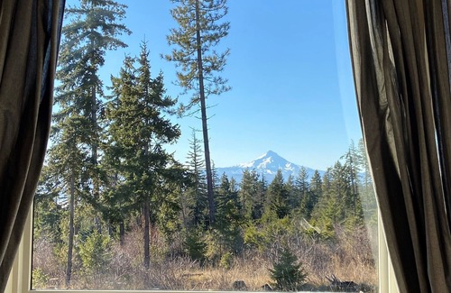 Escape to the beautiful sunny Columbia River Gorge for a relaxing getaway at this secluded custom-built home on 26 acres of forest land. The house is modern in architectural style and furnishings with sweeping views of Mount Hood.