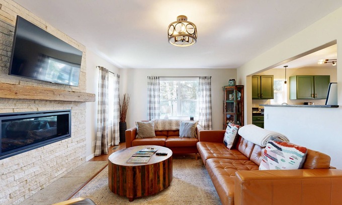 A friendly patio adjoins the open space and parks in the neighborhood at the townhome itself. The bright interior comes well-appointed with mountain-modern furnishings and all the comforts of home. Granite counters and updated LG appliances shine in the full kitchen, with an array of gadgets and a dishwasher for easy cleanup. There's room for the whole group at the window-front dining table. After the day's adventures, get cozy in front of the gas fireplace while streaming your favorite shows. Three well-appointed bedrooms, including two with en suite baths, await at the night's end, plus a bonus sleeping space on the top level. Free WiFi . Don't miss this rare find in the heart of the valley, minutes to world-class skiing, golf, fishing, and trails!