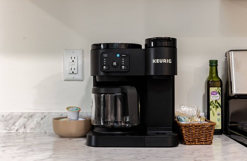 -Keurig coffee maker with drip coffee option, stocked with tea & coffee