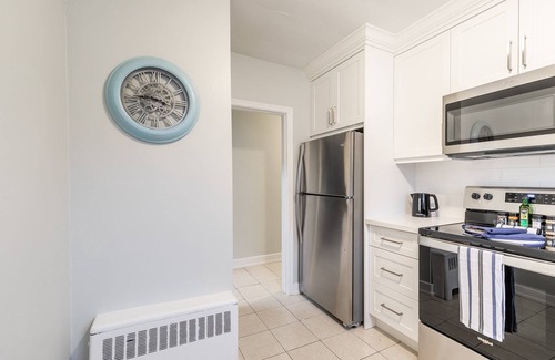 This 1-bedroom apartment has a comfortable Queen-sized bed bed and a sofa bed in the living room, so it can accommodate 4 guests at a time. The kitchen is newly renovated with stainless steel appliances, and includes a full sized fridge/freezer combo, dishwasher, oven, stove-top and microwave. There is a dining table with seating for 4, so you can enjoy home-made meals, or just flip open some take-out containers! The living room has a smart TV, with high speed internet connection.