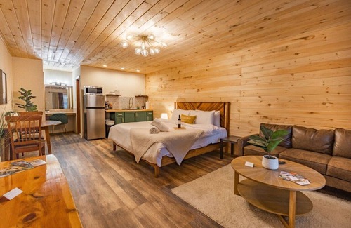 Have a relaxing stay in this charming cabin themed unit with modern amenities and tasteful décor, perfect to settle into after a hike, winery visit, or brewery tour. Nestle up in on a snowy day as you watch the flakes fall gentle onto the pine trees around you.