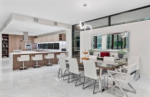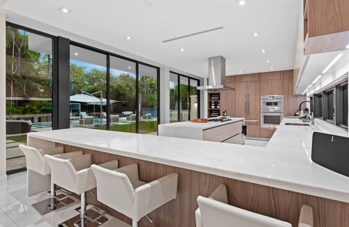 This modern contemporary house offers fresh vision of architectural design. Enter a dramatic foyer through 11ft custom impact glass pivot door and enjoy serene views of the 45 ft pool from living room with 22 foot ceilings, mature trees, lush landscaping and a garden with plenty of room for entertaining and relaxation. Stunning Italian kitchen opens to a large dining room, and a wonderful bbq area outside. Includes movie room, library, and rooftop deck!