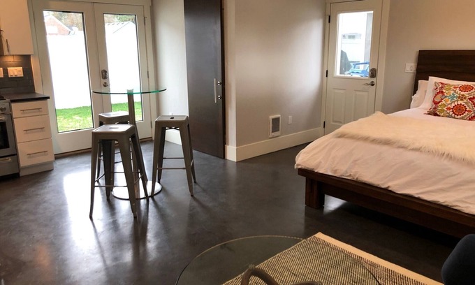New construction modern studio for 2 guests with private access and free private parking pad. Located 3 blocks from Sherman Avenue and the nearest dining and bars. Walking distance to shopping and Lake Coeur d'Alene. 1/2 block to Pearson's city park. Full kitchen with coffee, = bath with shower. No stairs. Amenities include wifi, laundry, smart TV, patio and lawn, and top-quality linens. Owner lives on the attached property.