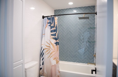 Full kitchen, quartz countertops, rainfall shower, flat screen & Keurig coffee bar!
