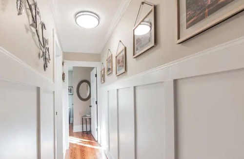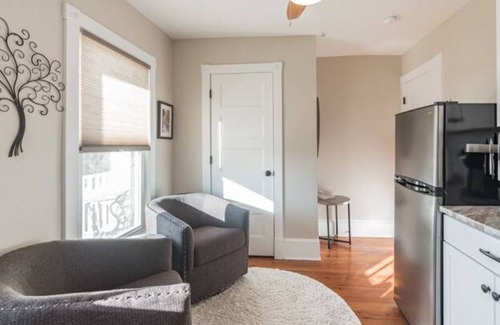 Recently upgraded and fully furnished throughout, this private upstairs portion of a colonial style home includes a master bedroom on second floor with full size bed with a large TV for enjoyment and a loft space on the third floor with two twin beds serving as the second bedroom. Bedrooms are comfortably furnished with beautiful new crisp linens, pillows and bed coverings. The main living space includes a well equipped kitchenette with refrigerator, microwave, induction cook top, and dishes. Indoor and outdoor seating areas, street parking, high-speed Wi-Fi and keyless access. There is an outdoor fire pit with wood is available for your use in the outdoor garden area!