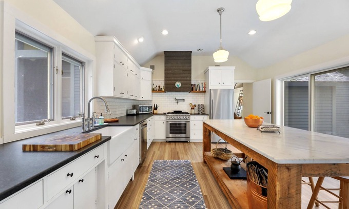The kitchen is fully stocked for cooking large family meals with all the necessary serving platters and accessories. The huge custom built island serves as the hub for gathering while cooking a meal or having breakfast.