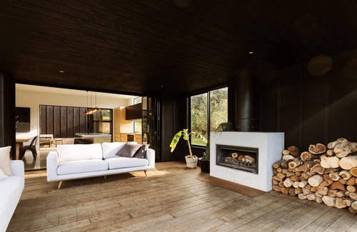 This newly built architectural home is the perfect place to stay for a relaxing holiday near the beach in Raglan. The modern interior and spacious outdoor living makes for a great getaway with friends or family. Go for a morning stroll to the beach to check the surf or head to a Pilates class within 5 minutes walk. Finish the day with drinks and nibbles by the outdoor fire. There is plenty of space on the lawn for kids to run around, while your relaxing on the deck surrounded by native bush