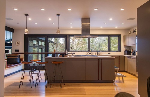 Creature comforts include six zone radiant HVAC, a wood stove, an Apple sound system, and a large deck for entertaining. The kitchen has SubZero and Wolf appliances, including a conventional and convection oven.
