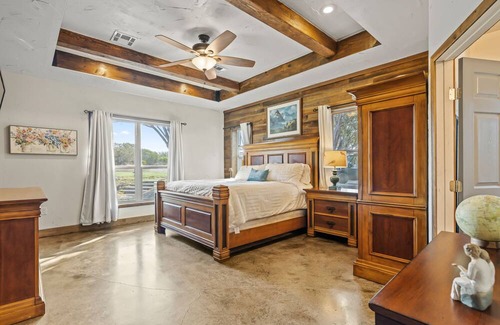 Distressed wood paneling and farmhouse-inspired decor maintain the pastoral charm throughout the single-level interior, while updated furnishings and appliances ensure total family comfort and convenience. A smart TV sets the stage for cozy home entertainment in the living room. Deluxe stainless steel appliances are equipped to add an elevated touch to down-home country cooking. There's also a gas grill out on the patio for authentic Texas barbecues. Fun can be found in the game room featuring a Ping-Pong table. A sunny reading room with a window nook and custom library offers a cozy spot for some quiet reading.