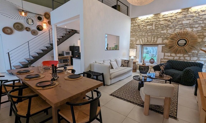 Outside: 850m² enclosed garden bordered by an arm of the Charente, unsecured access. 40m² terrace with plancha and garden furniture. On-site parking, reinforced socket for charging electric vehicles (included in the price). Greenway, museums, theater, cinema and CNDBI nearby. On an 18th century property, hidden from view, you will appreciate the space and volume of this house, combining modernity and authenticity. Located in a residential area of the Angoumois agglomeration, the cottage benefits from a calm environment surrounded by nature. Reception room for events and owners' house on the estate. The cottage is never rented at the same time as ceremonies, rentals from Monday to Thursday from May to the end of September.