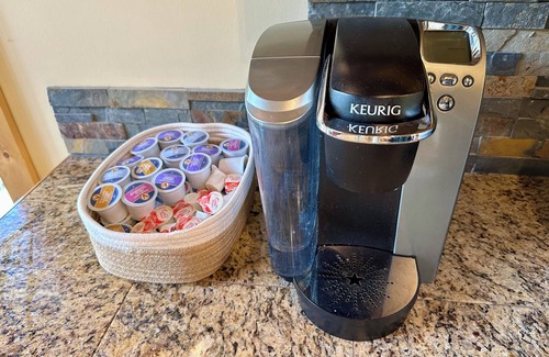 Open concept kitchen (fully stocked! incl. all cooking appliances you can think of and Keurig coffee bar), dining room, living room with wood burning fireplace.