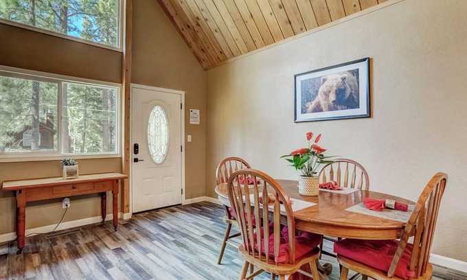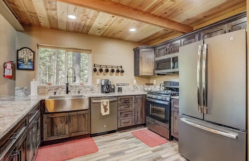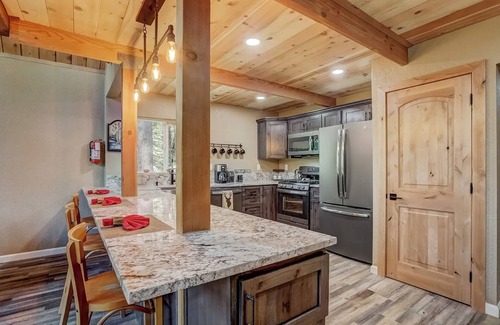 Nestled in a serene, forested setting with peek-a-boo views of the sparkling lake, this cozy retreat blends rustic charm with modern comfort. Perfectly located to take advantage of everything Lake Tahoe has to offer, from world-class skiing & thrilling lake activities to hiking, mountain biking, golfing & more. Whether you're here for adventure or relaxation, this cabin is the ideal home base. Enjoy the chef’s kitchen, or unwind & cozy up by the fire after a day of exploring.